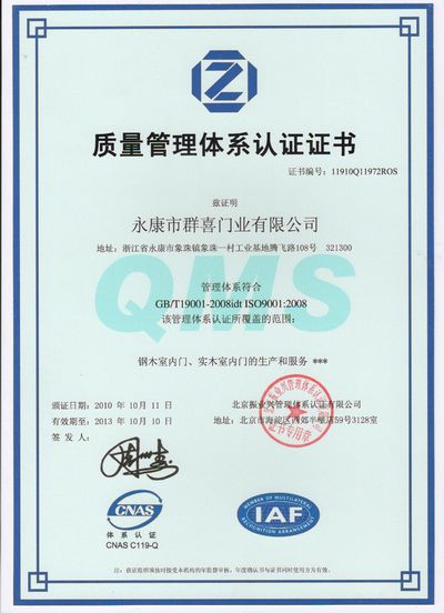 随着消费者对产品质量的进一步要求,群喜公司现已通过新版ISO9001:2008国际质量管理体系认证,进一步提升了群喜室内门的质量品质,从各个环节、工序进一步全面提升了产品的质量,以满足市场的要求,为消费者提供更加优质的室内门产品。