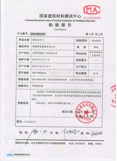 近日群喜室内门系列通过国家建筑材料测试中心的环保安全检测,甲醛等释放量远远低于国家标准,接近于零释放,成为市场上同类产品的佼佼者,比实木门都更环保。