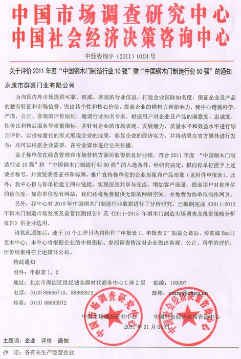 庆祝群喜门业获得2011年度中国钢木门制造行业10强