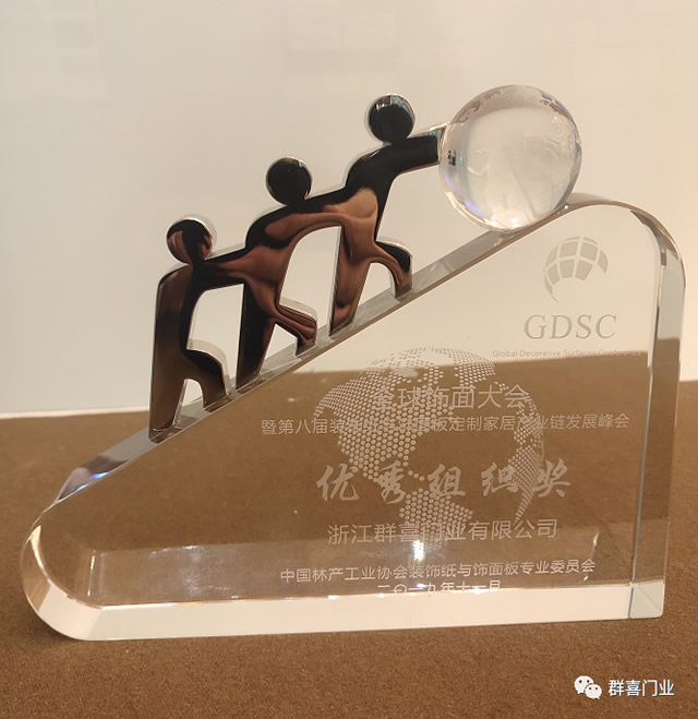 群喜门业专注为年轻人打造高品质的现代生活方式,原创设计,多年来公司始终采用德国夏特面板,坚守健康环保的理念。在此次大会上,群喜门业不负众望,在数百名行业大咖及1000多名企业代表的见证下,荣获了“优秀组织奖”。