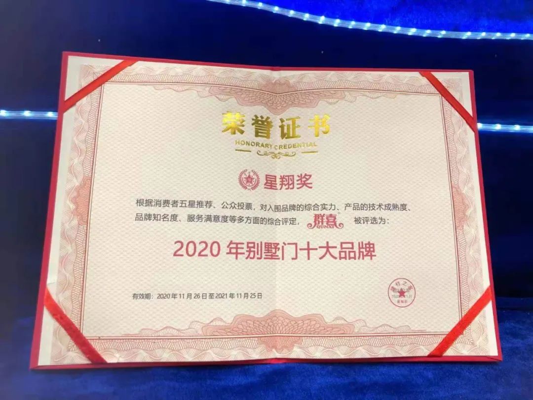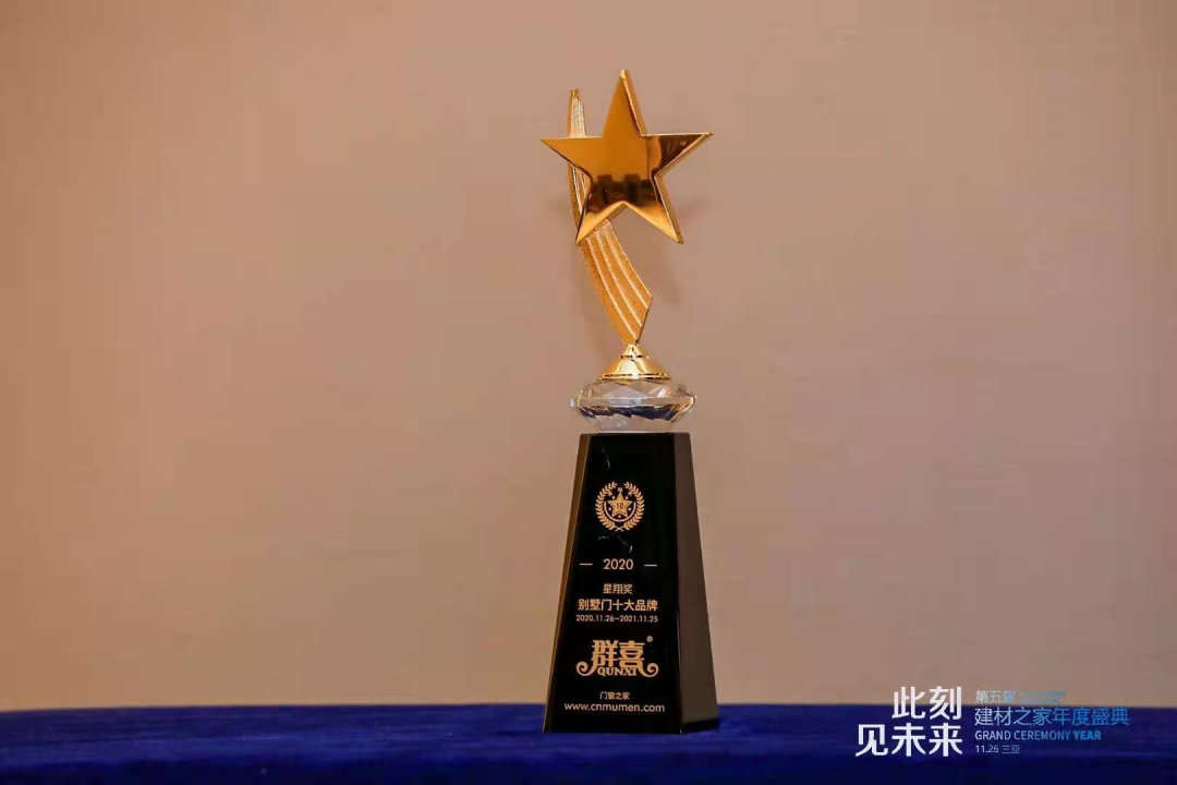 本次盛典榜单数据综合分析了企业实力、品牌荣誉、网络投票等各项实力数据所评选出。在当晚星光璀璨的颁奖典礼上,群喜凭借其雄厚的企业实力、领先的产品创新能力和精益求精的品牌价值突出重围,荣膺“星翔奖2020别墅门十大品牌”。