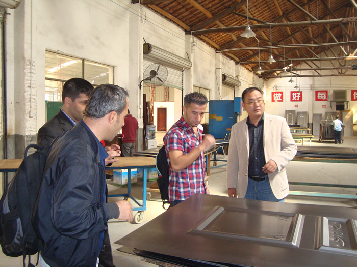 在即将结束兔年的同时,群喜门业这次接待了来自土耳其的外商客人。 1月2日, 土耳其外商详谈中了解到,此次参观为外商慕名前来,外商的到来使所有群喜人都自豪过,公司销售总经理高永稳先生先后带领外商等一行参观了群喜最新工艺的生产流水线,以及一道一道的工序,成品仓库和样品展厅。在了解群喜钢木门生产工艺及高档产品之后,双方随即签订了800樘左右环保钢木门的制作合同,当时表示,以后希望会有更多的合作。喜欢的就是群喜的产品和服务,与众多的钢木门品牌不一样。