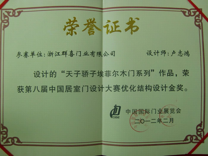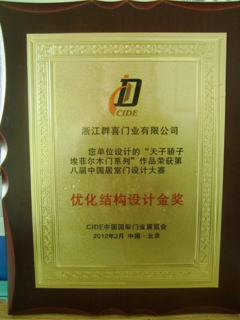 “天之骄子”款门以其独特的花型设计,凹凸工艺处理技术。符合当下80后的审美观和流行潮流,结合新型工艺实木套线相搭配的特点,获得了第八届中国居室门设计大赛的金奖!