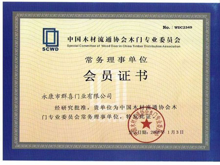 经过中国木材流通协会和木材市场专业委员会层层考核,并在2007年9月27日中国木材流通协会木门专业委员会会长张国林、秘书长王永林等领导亲自到永康市群喜门业有限公司视察,终于获得常务理事单位的名额。