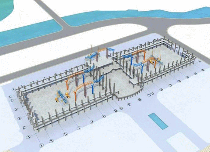 项目屋面呈波浪形,屋盖桁架跨度大、造型复杂,单品桁架最大起重量达30吨,现场拼装量大,拼装精度要求高。项目团队一方面运用BIM技术,对吊装机械设备的吊次、行走路线及起重性能等因素进行规划与核对,并通过合理设计拼装胎架,选择先进机动性强的大型吊装机械进行吊装,采用精密全站仪控制桁架安装精度。