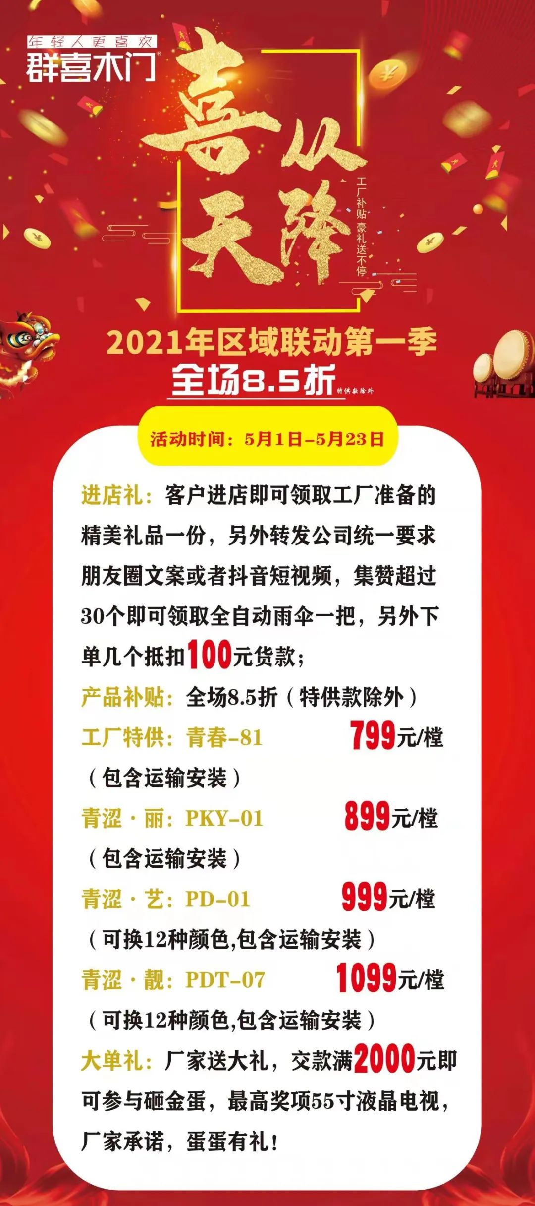 群喜木门喜从天降,特价商品,有颜值更有实力,是匠心精工好品质,更是为你量身定制的心动价。精致生活就现在,掀起这个五一最炙热的浪潮!