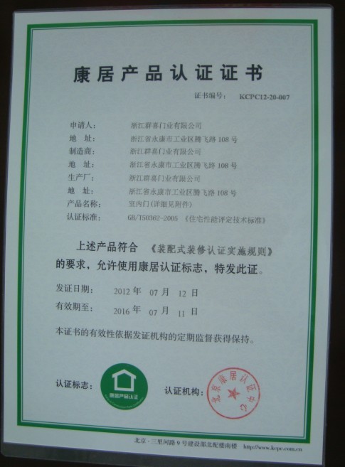 群喜公司在2011年7月开始筹备康居认证的一项事宜,经过康居认证专家几个月的严格检查和审核,也是群喜公司所有员工一直以来孜孜不倦的努力,在7月31号这天,群喜公司迎来了具有历史意义的一天,北京康居认证的证书正式下来了,这是群喜门业荣获全国钢木门行业的首家殊荣,标志着群喜门业正式领军钢木门一线市场品牌,并与永康大型企业王力、春天、步阳、富新等知名一线品牌相并行,为经销商开启领航的灯塔,也标志着群喜在未来的道路上会越走越好,越走越远,为全国钢木门行业献出群喜门业自己的一份力量!