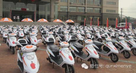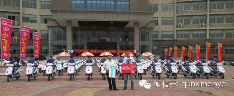 白色的电动车排成了一个方阵,四周插上群喜门业的彩旗,车上还独家粘贴了群喜代言人相声大师李金斗的代言肖像,这车开在路上,包管回头率百分百。