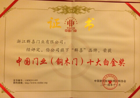 在所有群喜家人的努力下群喜门业喜获中国门业十大品牌白金奖