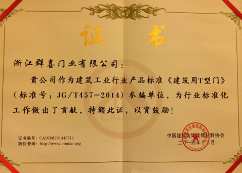 随后,中国建筑装饰装修材料协会和中国标准化研究院共同授予群喜门业(建筑用T型门)国家标准参编证书