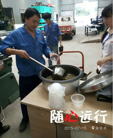 群喜门业此次供应的凉茶是经过行政部精心搭配的,配方有绿豆汤、甘草+薄荷叶、金银花、菊花茶,可防暑降温。在现场各位群喜人一个一个井然有序地拿着杯子排队接凉茶喝,各个员工乐开怀,小编知道群喜门业要的就是这样的结果,群喜不仅要员工开怀,同时也希望得到客户满意的笑容。保证品质、服务到位,这是群喜在行业里一致的佳话。