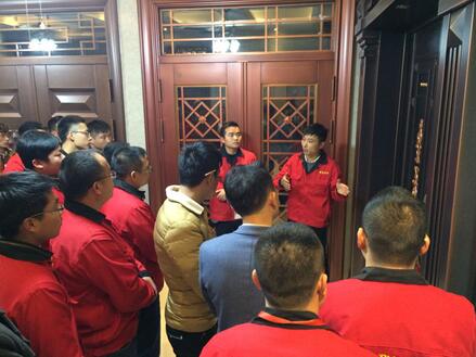 下午17:00,群喜门业总经理单泽喜率领公司销售、生产、采购、技术设计等部门主管,亲临位于东阳市下属一个镇《群喜门城体验馆》。对专卖店进行店员培训、店长指导、销售演练、技术讲解等指导工作。