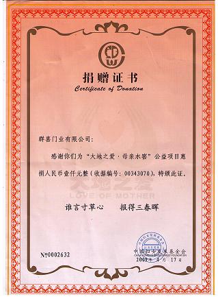 群喜门业作为中国木材流通协会木门专业委员会常务理事单位,献出自己的一份爱心,虽然很渺小,但是体现了群喜公司用于承担社会责任,积极回报社会的态度,只要我们每个人都献出自己的一份爱心,相信我们的母亲能够活得更好!