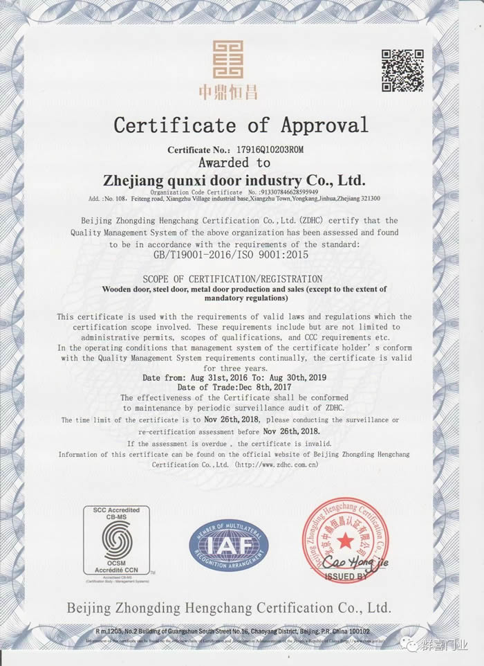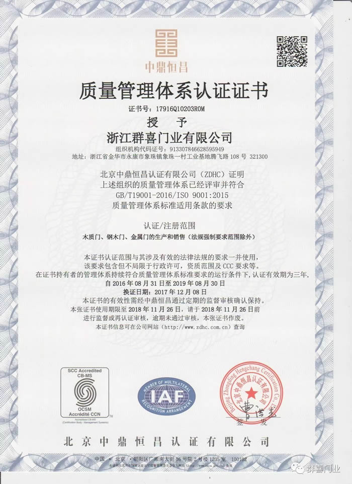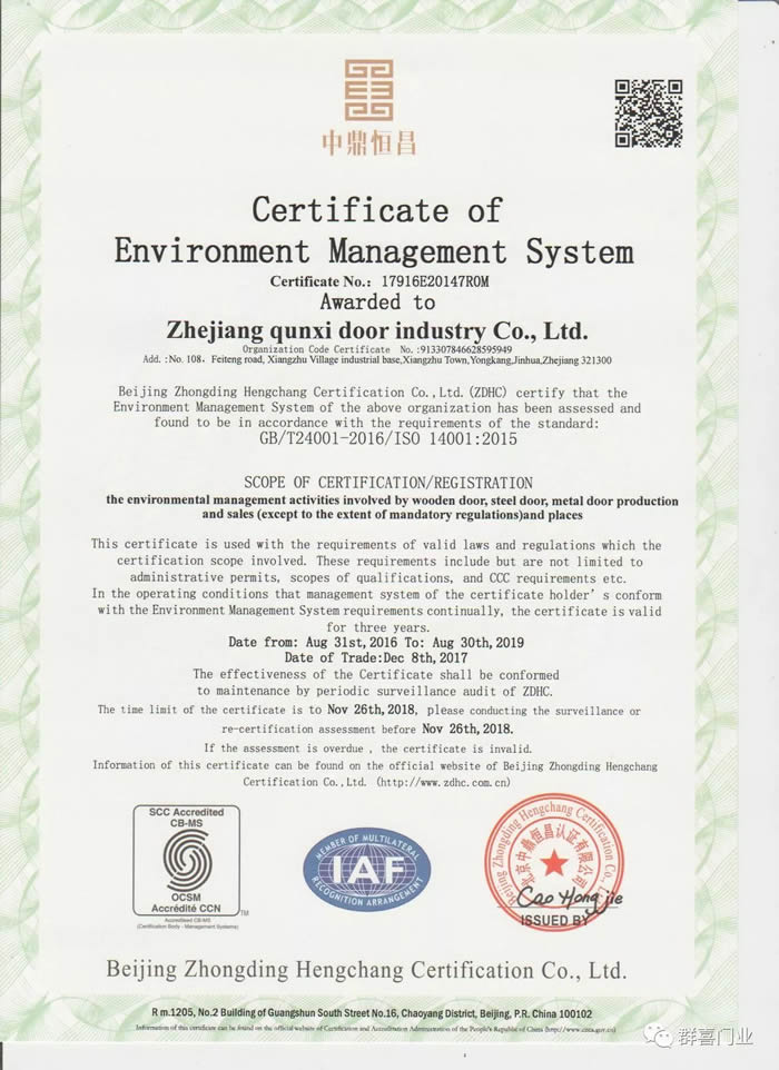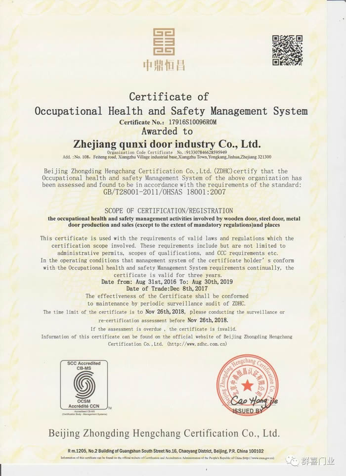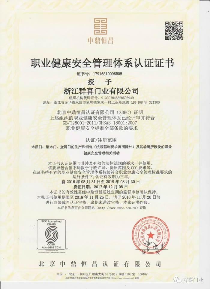 随着群喜门业业务的不断扩大,为了适应发展的需要,与国际接轨。2017年,各部门在公司领导层组织和带领下,认真学习ISO9001:2015、ISO14001:2015体系新标准,依据新版标准完善质量、环境管理体系,同时进一步规范内部管理,按照OHSAS18001:2007标准要求建立职业健康安全管理体系。