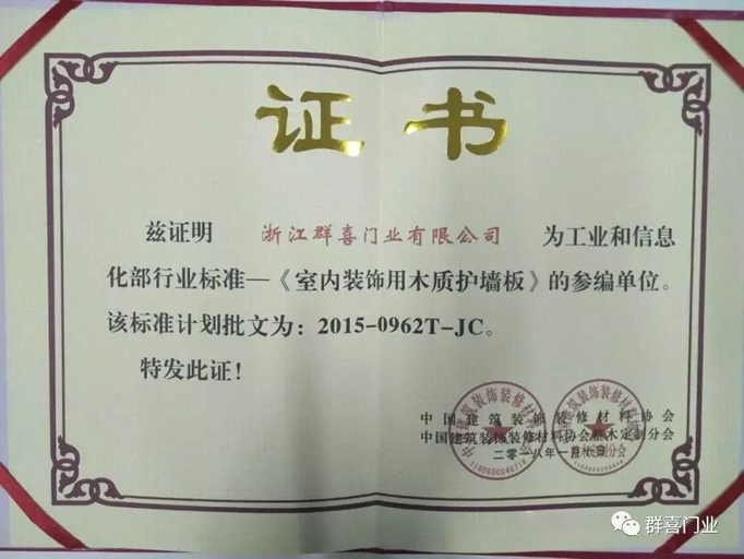 群喜门业是全国工商联钢木门专委会副会长单位,中国木材流通协会木门专委会常务理事单位,是4项国家行业标准主要起草单位,中国建筑金属结构协会会员单位,先后荣获“全国钢木门十强示范企业”,“浙商最具投资潜力企业”“质量诚信标杆企业”“售后服务标杆企业”等荣誉,并通过北京康居产品认证,ISO9001:2008国际质量管理体系认证、欧盟CE认证等权威认证。严格执行ISO14001环境体系认证,并致力于继承中国门庭艺术之精髓,融合国外门业技术之要义,结合市场需求推出新型产品,摆脱了传统木门对木材的依赖和受木材价格的左右,既环保又经济,是未来木质门业的发展趋势。